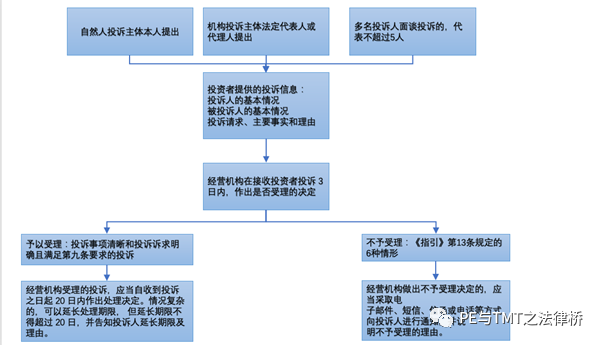 3)投诉处理流程。经营机构处理投诉的流程为:建立投诉台账,登记投诉事项;作出是否受理的决定;如决定受理,则根据不同情况在受理后20日内作出处理决定(履行义务、作出赔偿/补偿、进行解释或协商等);如不予受理,则及时通知投资者并说明理由;登记处置结果等,具体流程参见下图: